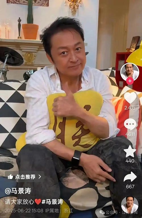 6月22日,63岁知名演员马景涛通过个人抖音账号,跟网友报平安,回应疑因闷热中暑昏厥传闻。