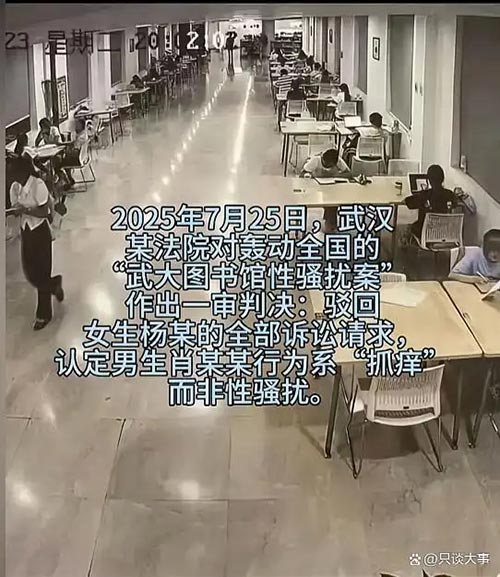 2025年7月25日,武汉市洪山区法院对“武大图书馆性骚扰案”作出一审判决:无法认定肖某某的行为构成性骚扰,驳回原告杨景媛的全部诉求。判决书详细列明关键证据:医学专家鉴定肖某某因严重湿疹抓痒,动作节奏与自慰特征不符;监控显示两人全程无交流,不存在针对性骚扰意图。
