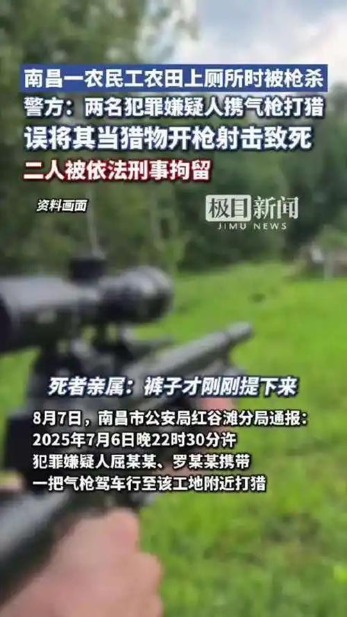 通报称,7月7日凌晨1时,该局接群众报警称,某工地工人游某某收工离开工地后很久没有回到工地宿舍,工友四处寻找没有找到,请求帮助。属地派出所立即组织搜寻,凌晨1时50分左右,在距工地宿舍约800米处田地里发现游某某遗体。经调查,2025年7月6日晚10时30分许,犯罪嫌疑人屈某某、罗某某携带一把气枪驾车行至该工地附近打猎,屈某某误将蹲在田地里的游某某当做猎物开枪射击,造成游某某死亡。7月8日,屈某某、罗某某被依法刑事拘留。目前,案件正在进一步侦办中。”