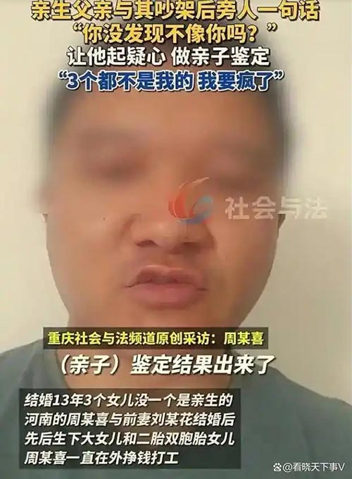 河南,男子结婚13年生了3个女儿,自己任劳任怨在外地打工赚钱养家,结果一次吵架,邻居说了句“你没发现女儿长得不像你吗?”这样男子瞬间懵了,他偷偷带着三个女儿做了亲子鉴定,结果真让邻居说着了,三个女儿都不是他亲生的