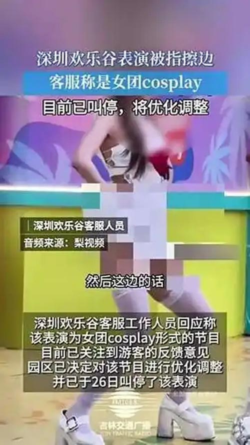8月27日傍晚,记者致电深圳欢乐谷景区,客服人员回应称,该表演为女团cosplay形式的节目,已于26日叫停该表演。关于为何会有该演出安排,记者在客服人员指引下联系了欢乐谷景区市场部,一名男性工作人员了解到记者身份后直言,“欢迎向有关部门举报”,随后挂断了电话。