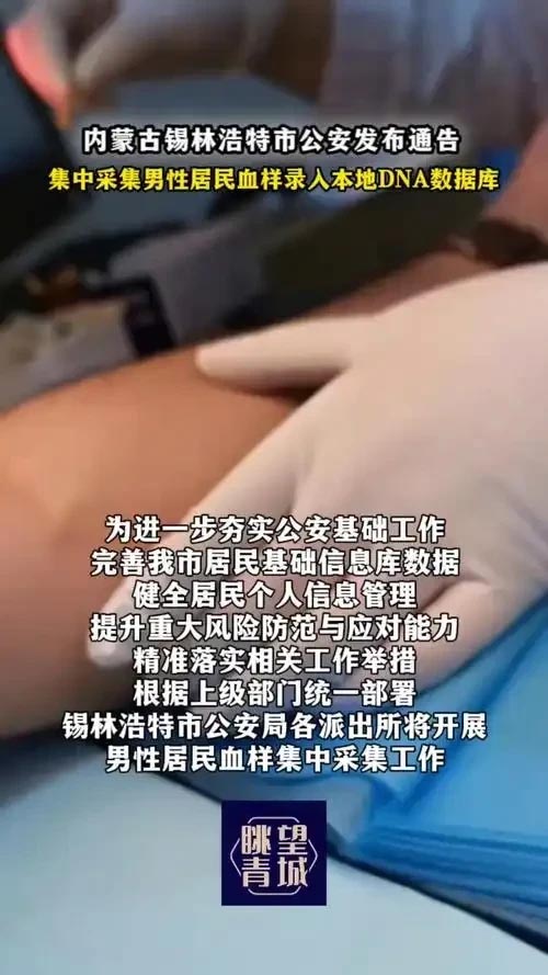 9月20日,内蒙古自治区锡林浩特市公安局对外发布通告称,9月5日起集中采集辖区内男性居民血样录入本地DNA数据库,并表示本次血样采集的作用是完善公民身份信息,直接关联到个人身份证、护照等证件的办理。对于防范老人儿童走失、人员身份信息确认等方面,具有重大作用。
