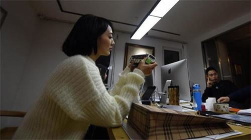 晚上10点多,等待其他同伴开会的空挡,王宇冰露出了一些倦意。几个小伙伴在鸭货产品选择公交车车身广告位置上产生了分歧,有人赞成侧面,注重路人,有人偏向尾部,注重车友。图为王宇冰拿着公交车模型思考。
