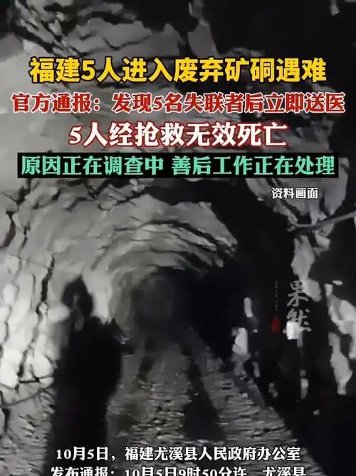 【“5人进废弃矿硐遇难”急救人员发声:被救出硐时已无生命迹象,准确死因待鉴定】#5人被救出废弃矿硐时已无生命迹象#据福建省三明市尤溪县政府通报,10月5日,5名人员进入该县坂面镇一矿山企业的废弃矿硐后失联,救援力量迅速赶赴现场将5名失联人员救出,但5人经抢救无效死亡。5日晚,极目新闻记者从尤溪县官方了解到,事发地是位于坂面镇肖坂村的一个金矿,该矿已关停多年,涉事的废弃矿硐硐口也早被封闭,这次不知何故被人打开。#5人进废弃铜矿遇难准确死因待鉴定#