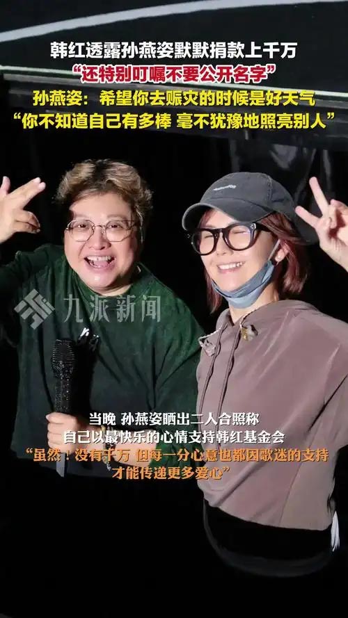 10月7日,韩红在北京演唱会透露好友孙燕姿多年来通过韩红爱心慈善基金会匿名捐款超过千万元,并一直以“孙女士”署名,叮嘱不要公开其姓名。韩红觉得需要宣传好人好事,时代也需要正能量,引现场观众共鸣。