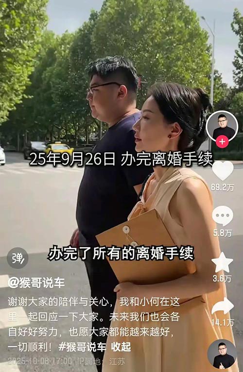 10月8日,千万粉丝网红“猴哥说车”发布视频称,二人已于9月26日办理离婚手续, “和平分手,生活不是剧本,总会有一些意料之外的分歧”。