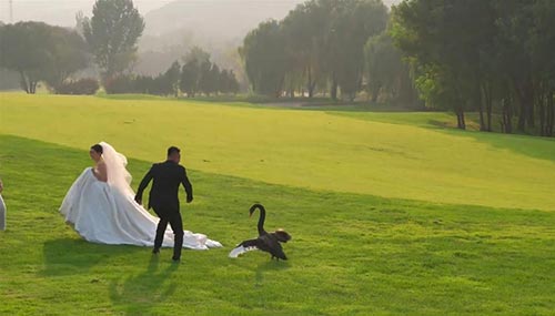 这段视频作为摄影花絮被记录下来,发布在社交平台上,引发网友热议。有网友说,这比摆拍有纪念意义,还有网友将两位新人和黑天鹅制作成AI图片,以幽默的方式,向新人送上祝福。