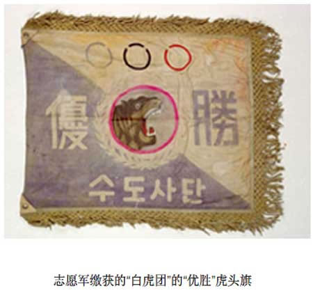 有人认为这面旗只是体育比赛的奖旗,笔者不赞同。想想假若解放军的某个团去前线打仗,一面参加体育比赛的奖旗不放在后方的荣誉室里,而是随身带着还挂在战地指挥所的墙上,合理吗?所以照军博的说法,这旗是“优胜虎头旗”。但具体是因为何事授奖,值得这个“飞虎团”在打仗时还随身携带,就不得而知了。有资料称是飞虎联队在襄阳(朝鲜地名)之战中表现出色而得到的嘉奖,具体是不是这样,需要进一步考证韩军的战史资料。