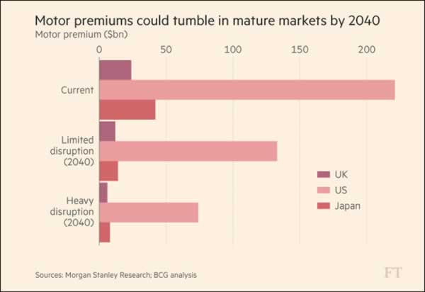 分析师们表示,新技术以多种方式让汽车保险市场的很大一块遭受威胁。首先,上路的汽车更少,汽车的事故也更少,这意味着对汽车保险的需求减少了。到2040年,在成熟的经济体,汽车保险市场的规模可能缩水逾80%。第二,所需要的保险将会由汽车制造商等企业购买,而不是由消费者购买。而随着汽车制造商和科技企业改进数据的收集和应用,在销售保险上,它们可能处于比保险行业本身更有利的地位。
