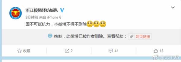 晚7时许,毅腾官微删除了下午的微博,称遭到不可抗力。