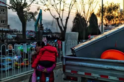 11月20日中午,新建村比往常更显喧闹,村口牌楼下方熙熙攘攘的人群,来回进出的小型货车,装满新旧家具的三轮,在泥泞的道路上相互拥挤着,“让一让”、“快点快点”,一些装修、理发、工艺店铺的商户将家具和货物拖运出店门。