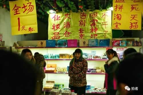 一些商铺在疯狂甩卖货品。“10元一双”的白纸片贴在各个鞋店玻璃门上,特价处理的鞋子随意铺满店内。美妆店里挤满了手提购物篮的女性,“三折”、“清仓甩卖”的字样贴满小店的角落。凡是做生意的商铺,总能看见一两位店员站在柜台前,扯着嗓子吆喝,“给个价也卖,赶紧的嘞”,声音沙哑。