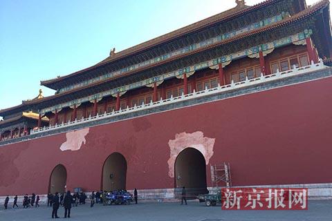 故宫午门墙皮脱落。新京报记者 赵凯迪摄