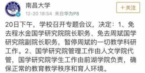 2017年12月20日晚,南昌大学官微发博称,免去程水金国学研究院院长职务与周斌国学研究院副院长职务,暂停周斌的一切教学科研工作。