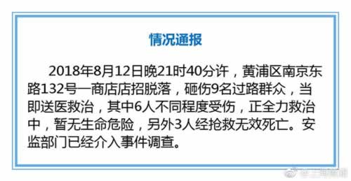 2018年8月12日晚21时40分许,黄浦区南京东路132号一商店店招脱落,砸伤9名过路群众,当即送医救治。