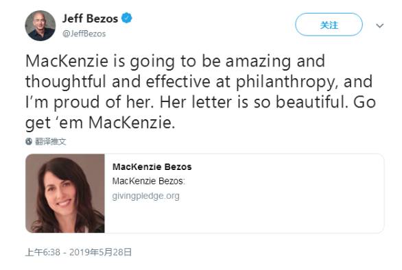 贝佐斯28日发文赞扬了前妻的做法,“麦肯齐的慈善之举很了不起,是经过深思熟虑且卓有成效的, 为她感到骄傲。她的公开信令人印象深刻。”
