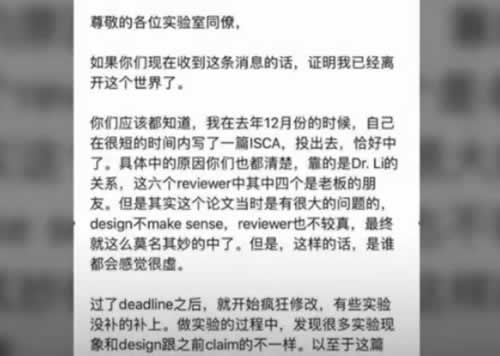 (原标题:中国博士生在美自杀 留遗书指控华人导师:被逼学术造假)