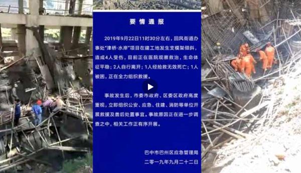 2019年9月22日,四川巴中一在建工地发生支模架倾斜,造成3人受伤,经医院观察救治,目前生命体征平稳。另外1人经抢救无效死亡,还有1人被困,经全力救援后宣告死亡。事故原因正进一步调查中。