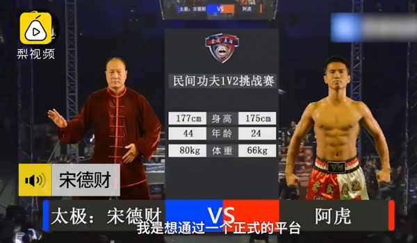 2019年10月19日晚的一场搏击比赛中,太极大师宋德财80秒被ko,被网友戏称“怎么一打就跑”。宋德财回应梨视频,自己第一次上正规擂台,没受伤,但对手实力超出想象。传统武术不是不行,要看个人,个人功夫好还是有得一拼。