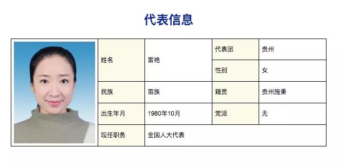 “政事儿”注意到,雷艳是一位歌手,也是国家一级演员,出生于1980年10月,无党派,籍贯贵州施秉,是十二届、十三届两届全国人大代表。