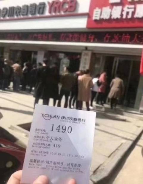 10月29日,河南伊川农商银行多个网点储户争相取钱,取款柜台前排起长队。有网友发布的业务办理单显示,其前面有490人排队。网传视频显示,伊川农商银行凤山分理处、八一路支行等网点对外贴出公告,10月29日营业时间延长至19:30,非营业时间可通过伊川农商银行手机银行、网上银行、自主设备等办理业务。
