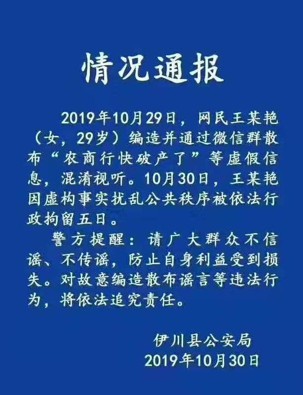 据伊川县警方通报,2019年10月29日,网民王某艳(女,29岁)编造并通过微信群散布“农商行快破产了”等虚假信息,混淆视听。10月30日,王某艳因虚构事实扰乱公共秩序被依法行政拘留五日。