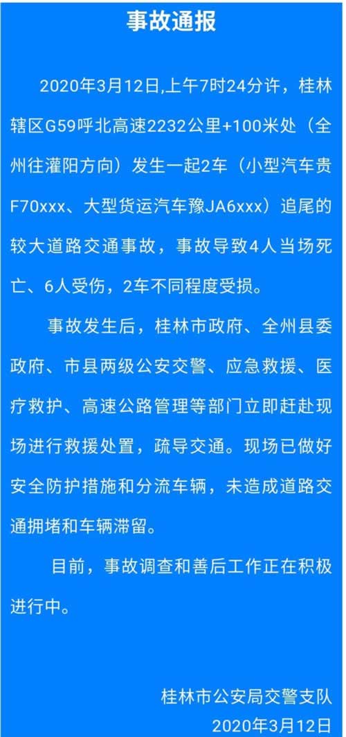 3月12日上午7时24分许,广西桂林辖区G59呼北高速2232公里+100米处(全州往灌阳方向)发生一起两车(小型汽车贵F70xxx、大型货运汽车豫JA6xxx)追尾的较大道路交通事故,事故导致4人当场死亡、6人受伤,两车不同程度受损。