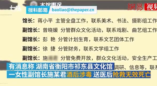 湖南衡阳市祁东县一网民5月4日称,衡阳市祁东县文化馆一80后女副馆长施某某5月2日因酒后涉毒送医治疗。3日,施某某因抢救无效死亡。
