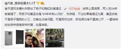 28日,有网友爆料称其实杨子和陶虹早在2004年就离了婚,同时还晒出了陶虹和杨子的离婚证,爆料账号“八卦_我实在是太CJ了”在微博写到“有天涯网友爆料并晒出了杨子和陶虹的离婚证,按照上面信息,两人在04年就离婚了,而杨子和黄圣依是“05年年底认识的”,先存疑,不过如果离婚证为真,黄圣依就不是杨子婚姻的小三,恋爱也没啥问题。可是既然这样,那他俩为啥不直接公开,一直神神秘秘各种遮掩各种折腾,也是神奇。”在网友晒出的离婚证上,能清楚的看到杨子妻子陶虹的照片和姓名,登记日期上写着2004年3月2日,在离婚证的下方写着陶虹和杨子的讯息。
