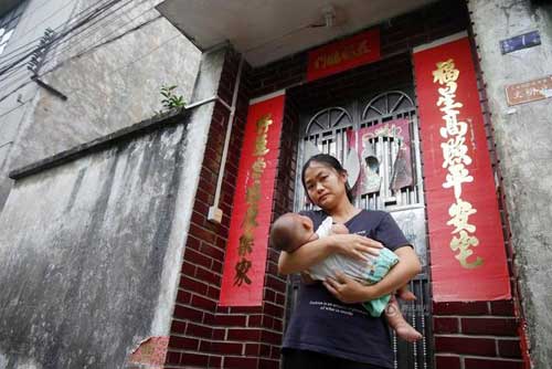 图为7月28日,阿纯抱着孩子站在上了锁的家门口。